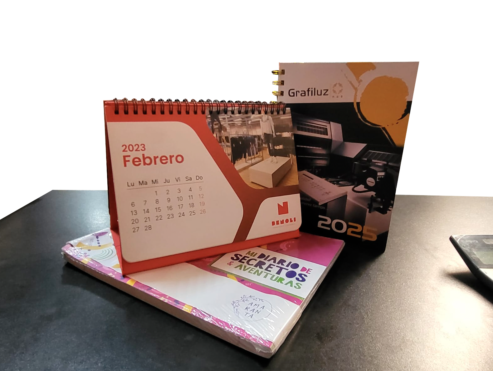 Cuadernos, calendarios, bolsas, cajas, etiquetas, stickers y artículos promocionales impresos.